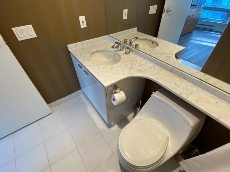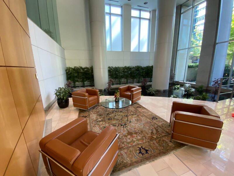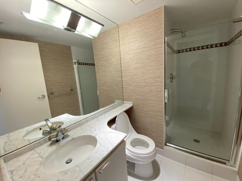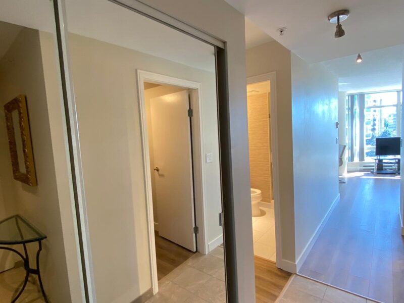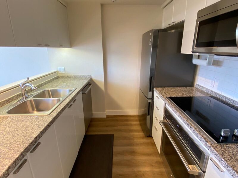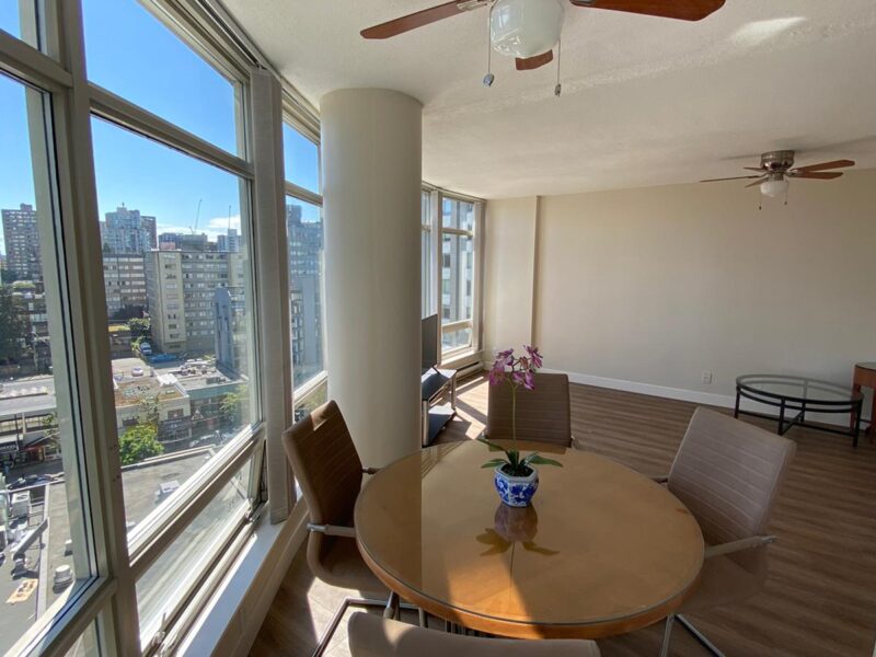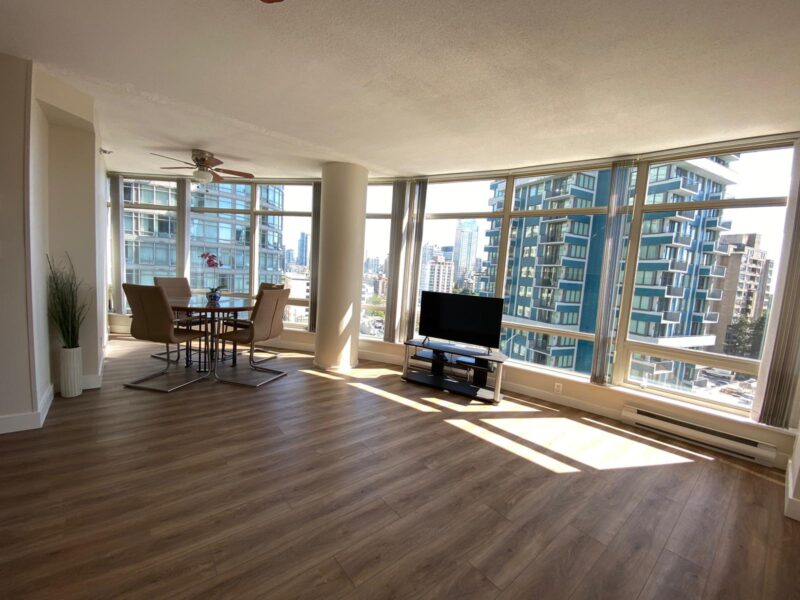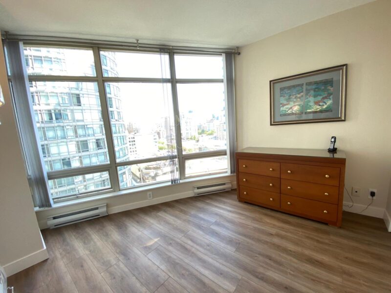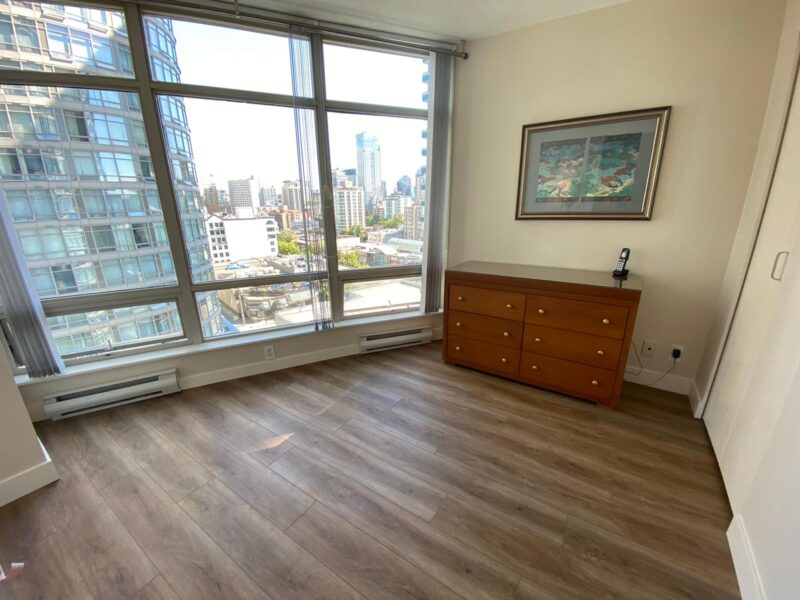 Recently renovated at 900 sqft, this unit boasts 2 bedrooms, 2 bathrooms (including the master ensuite) a large DEN/OFFICE space, brand new luxury laminate flooring, a modern kitchen w. stainless appliances, in-suite laundry and wrap around floor to ceiling windows that bathe the suite in natural light. The building provides for a conference area and multiple meeting rooms, beautiful Japanese inspired outdoor space and a water feature as well as a gym/steam/sauna facility.